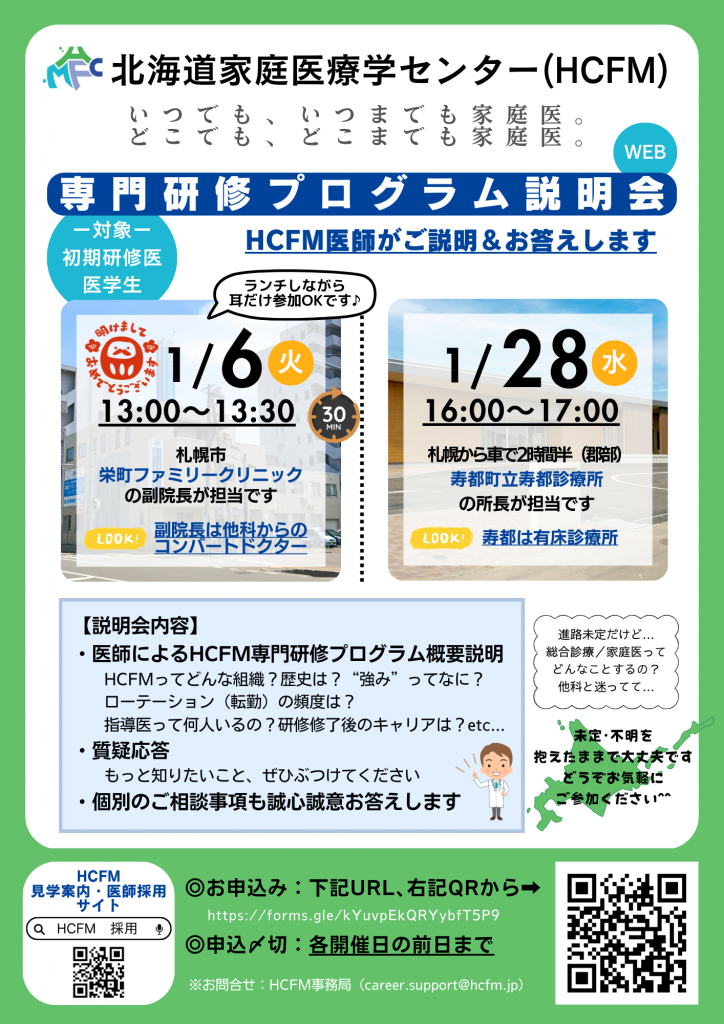 北海道家庭医療学センターの専門研修プログラムに関するオンライン説明会です。