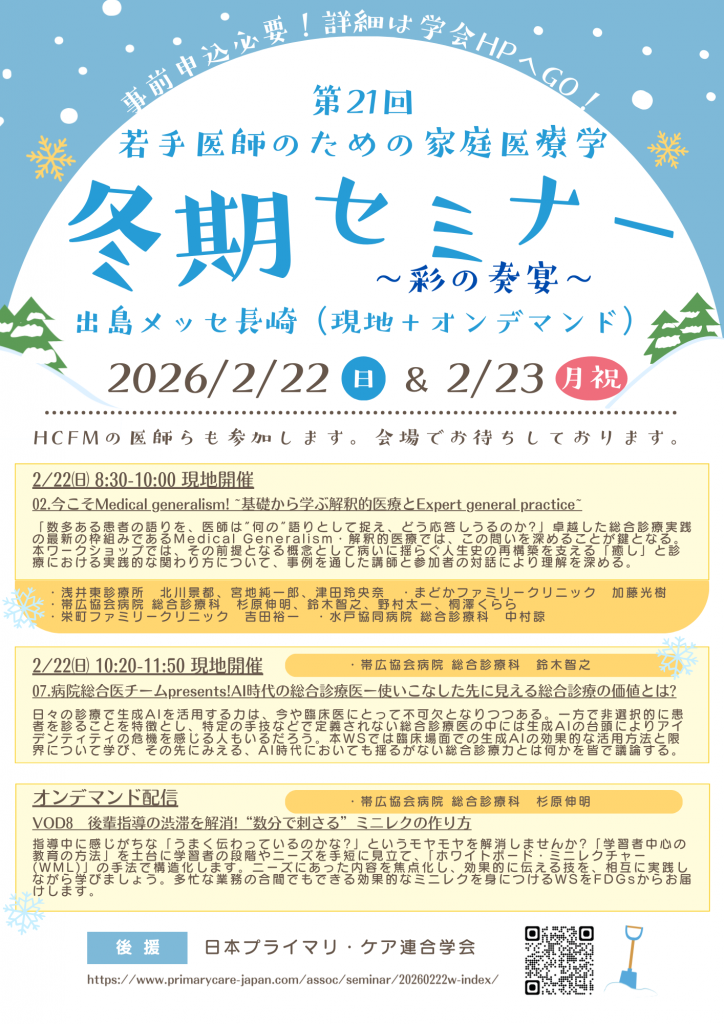 冬期セミナーの詳細、お申込みは日本プライマリ・ケア連合学会HPまで